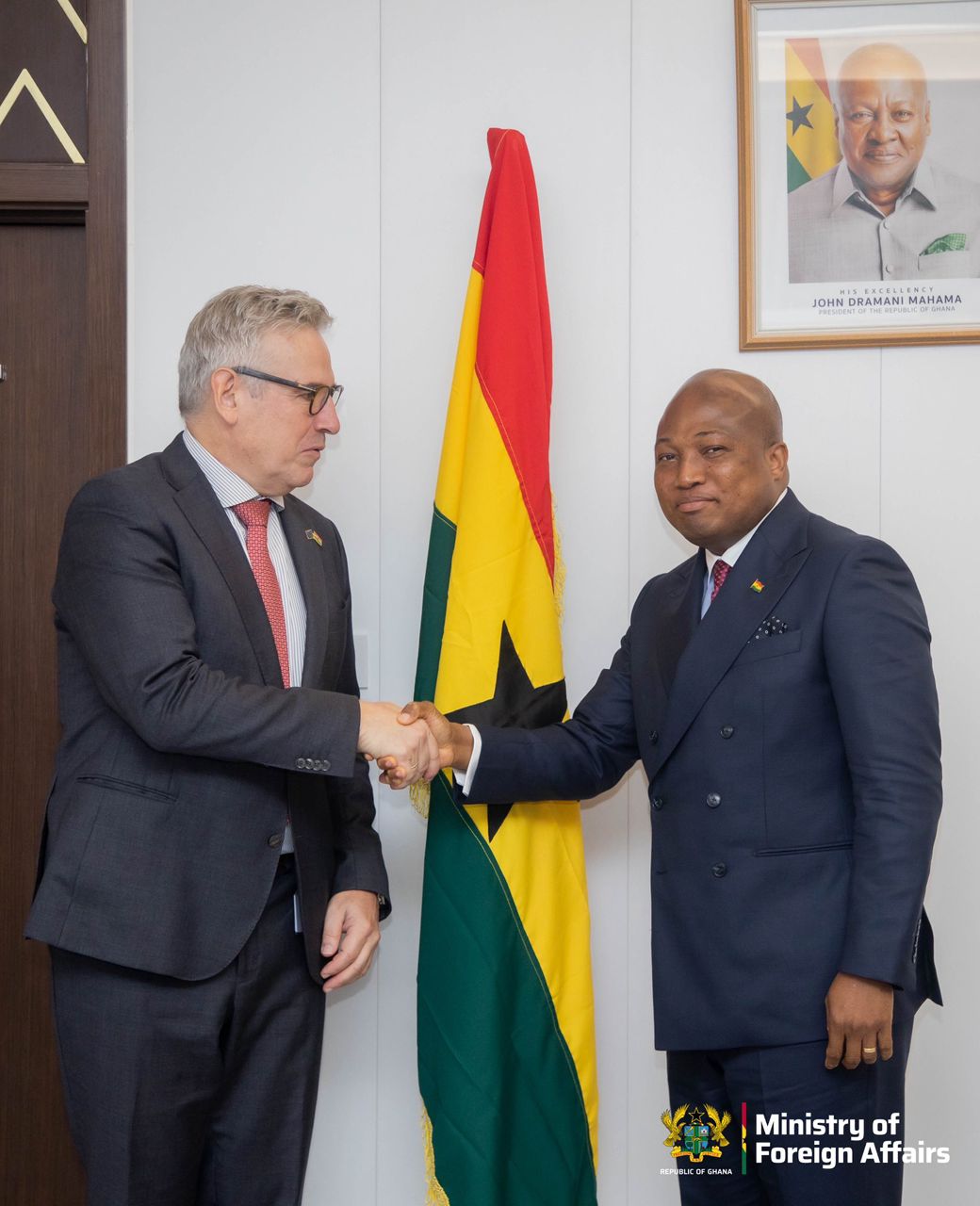 The Minister for Foreign Affairs, Hon. Samuel Okudzeto Ablakwa, has held a highly productive meeting with His Excellency Rune Skinnebach, Ambassador of the European Union to Ghana, during which both parties reaffirmed their commitment to elevating the longstanding partnership between Ghana and the European bloc.