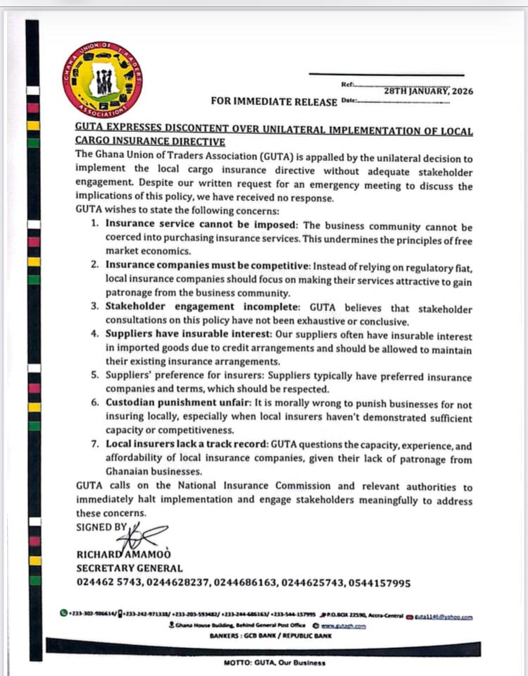 In a statement signed by Secretary-General Richard Amamoo on January 28, 2026, GUTA expressed concerns over the mandatory imposition of local insurance on businesses, inadequate stakeholder engagement, and the limited competitiveness and experience of local insurers.